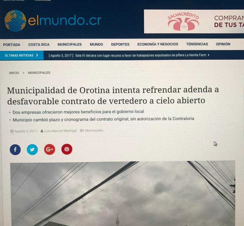 A través de un comunicado de prensa (con fecha 7 de agosto), la Municipalidad de Orotina salió al paso a varias notas publicadas en el medio digital elmundo.cr en relación con el contrato que se mantiene con la firma WPP, encargada del manejo de los desechos del cantón.